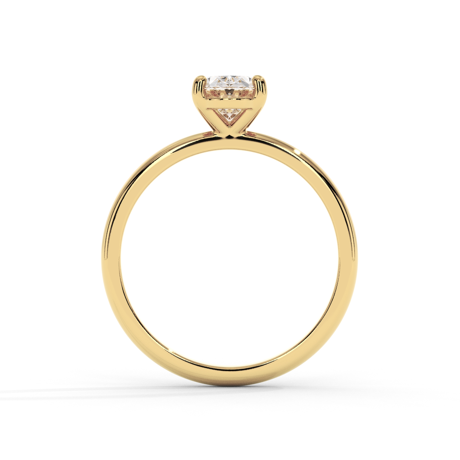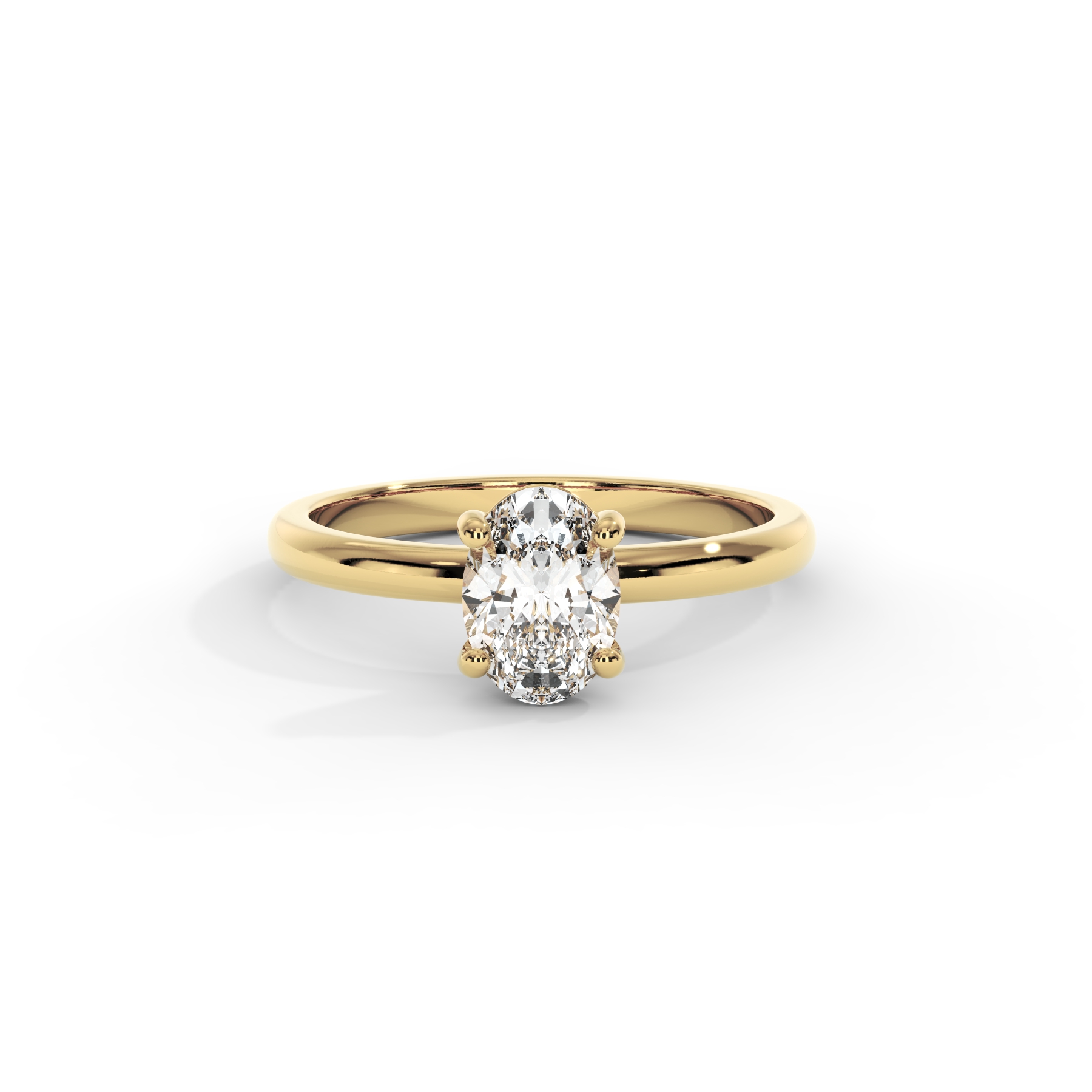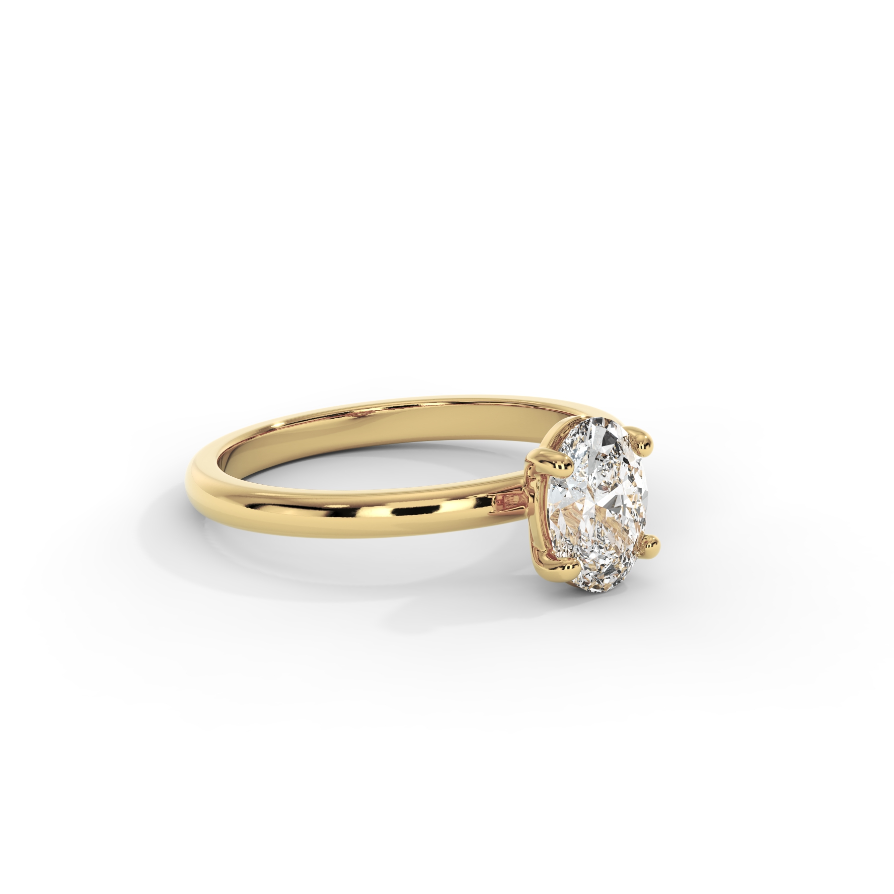 A single, flawless 1.00-carat natural oval diamond (F, SI1) sits at the heart of this yellow gold ring, offering a modern take on timeless elegance.