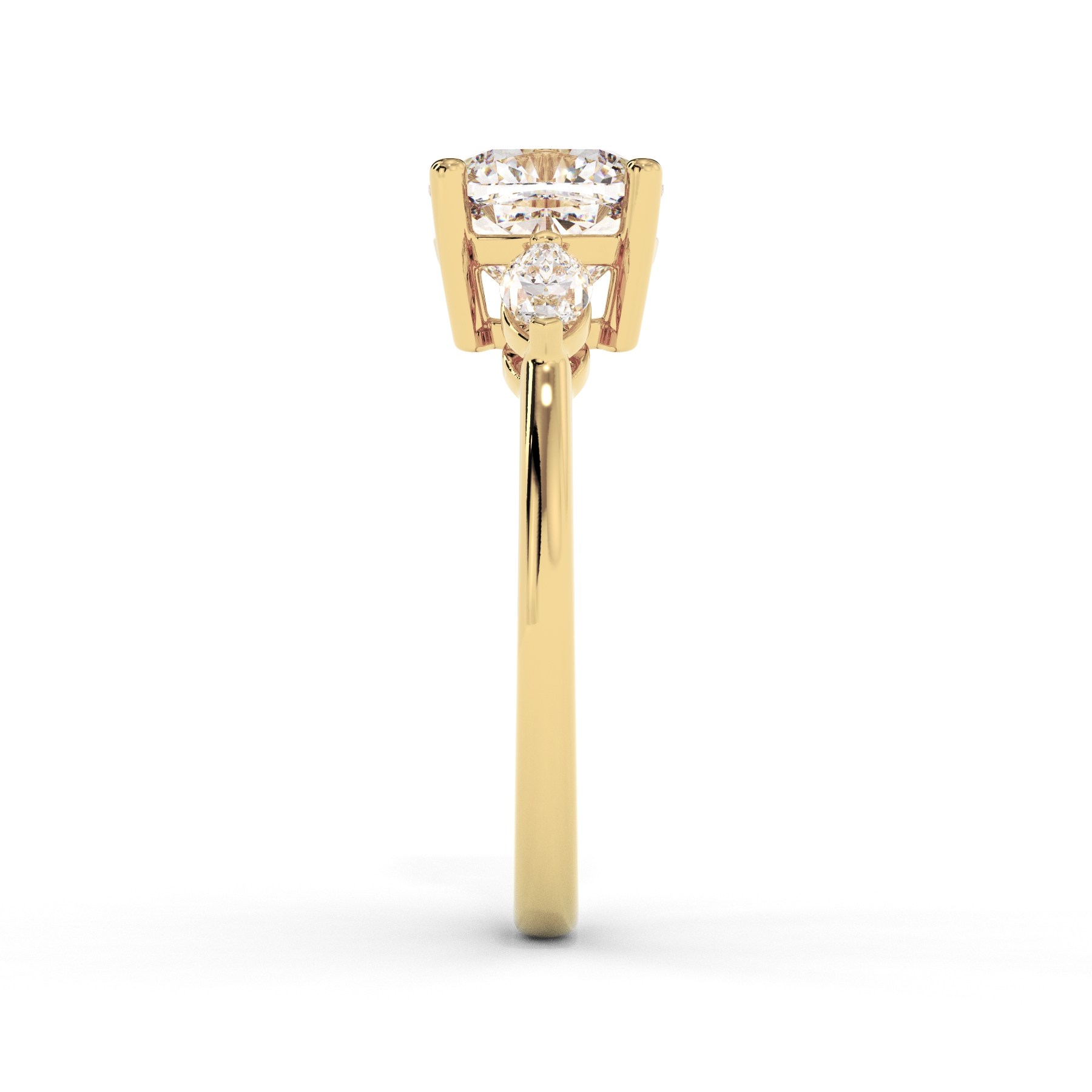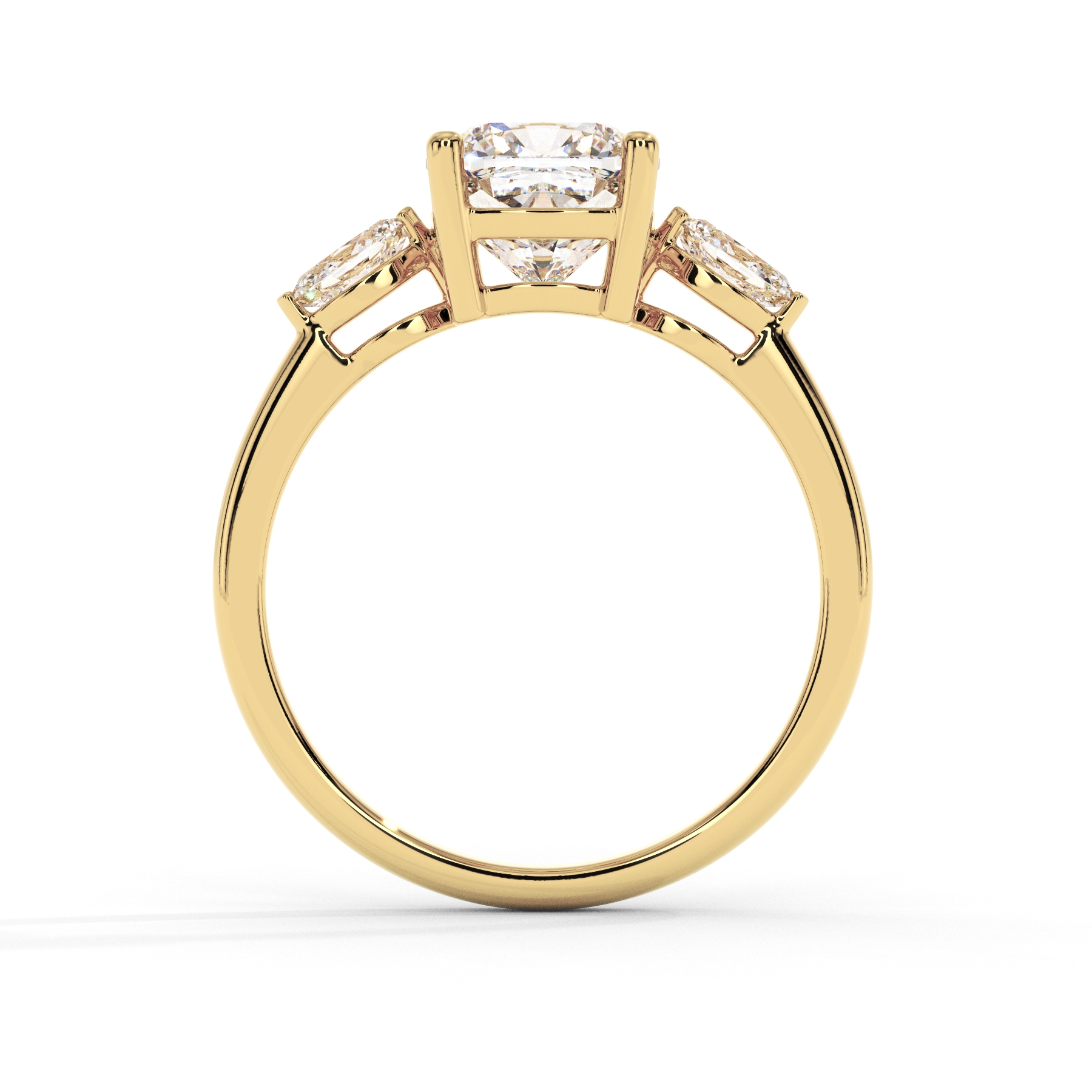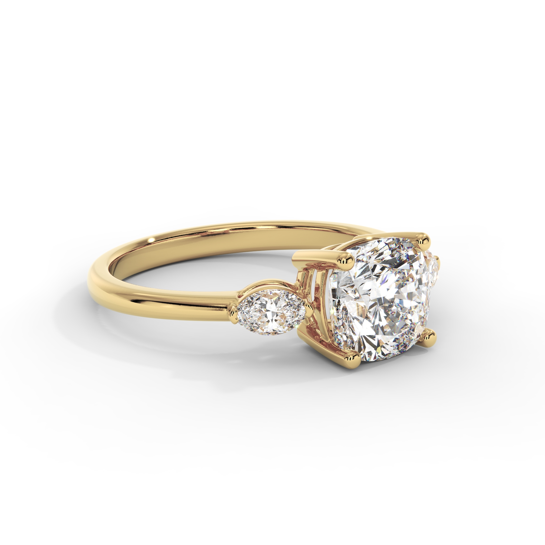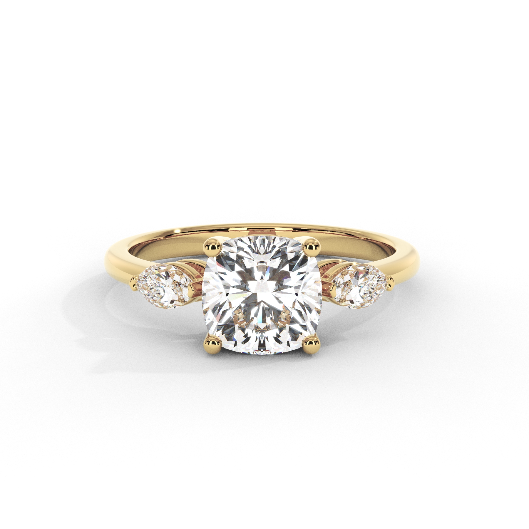 The Grace Cushion Lab Grown Diamond Engagement Ring is an exquisite union of timeless design and contemporary allure. Central to its charm is a 2.00-carat lab-grown cushion-cut diamond, resplendent with a VS2 clarity and an F color that exudes sheer brilliance. Complementing the main gem are two pear-shaped diamonds, summing up to 0.30 carats, chosen meticulously for their D-F color and VVS clarity. These side stones add an elegant flair, enhancing the ring’s profile with their exceptional sparkle. The combined total of 2.30 carats is nestled within a sleek band, available in choices of yellow, silver, or rose gold, catering to a bespoke aesthetic preference. The Grace Ring is for the one who holds a vision of eternal beauty and desires a ring that reflects the depth of their affection.