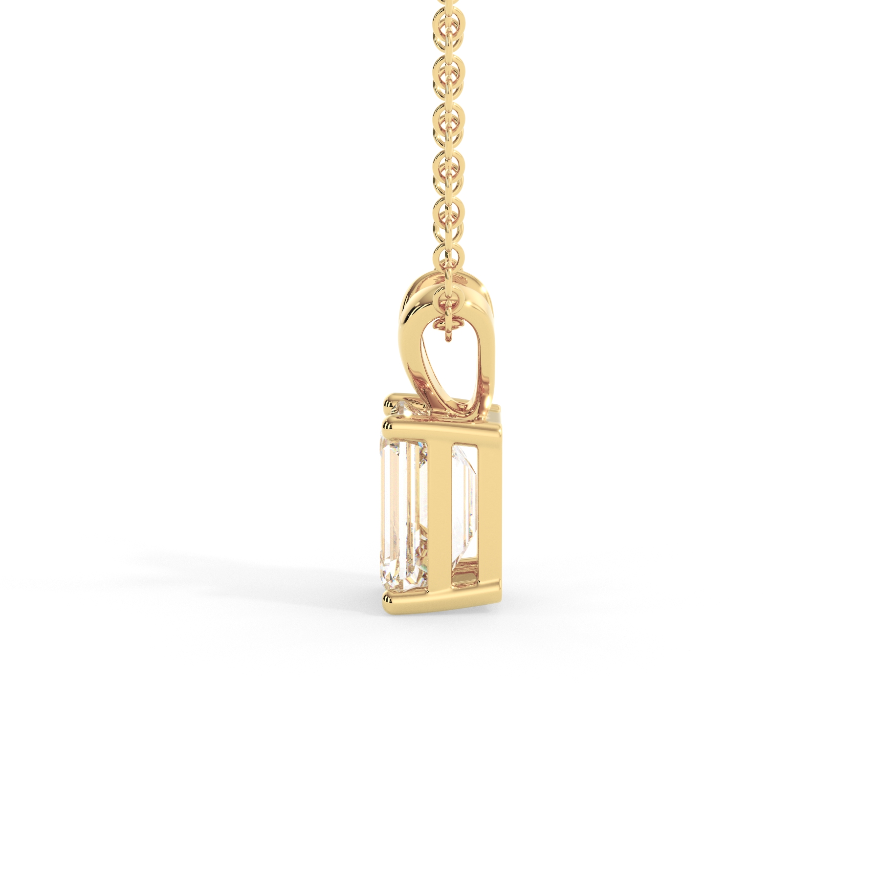 The Solitaire Emerald Lab Grown Diamond Pendant epitomizes sophistication with its central feature—a magnificent 1.50-carat emerald-cut diamond of F color and VS clarity. The precision of the emerald cut showcases the diamond’s clarity, creating a mirror-like effect that captivates and reflects light brilliantly. Offered in your choice of yellow, white, or rose gold, this pendant hangs gracefully on a classic chain available in lengths of 16, 18, 20, or 24 inches to suit your style and preference. A harmonious blend of traditional elegance and contemporary design, this pendant is a luxurious addition to any jewelry collection.