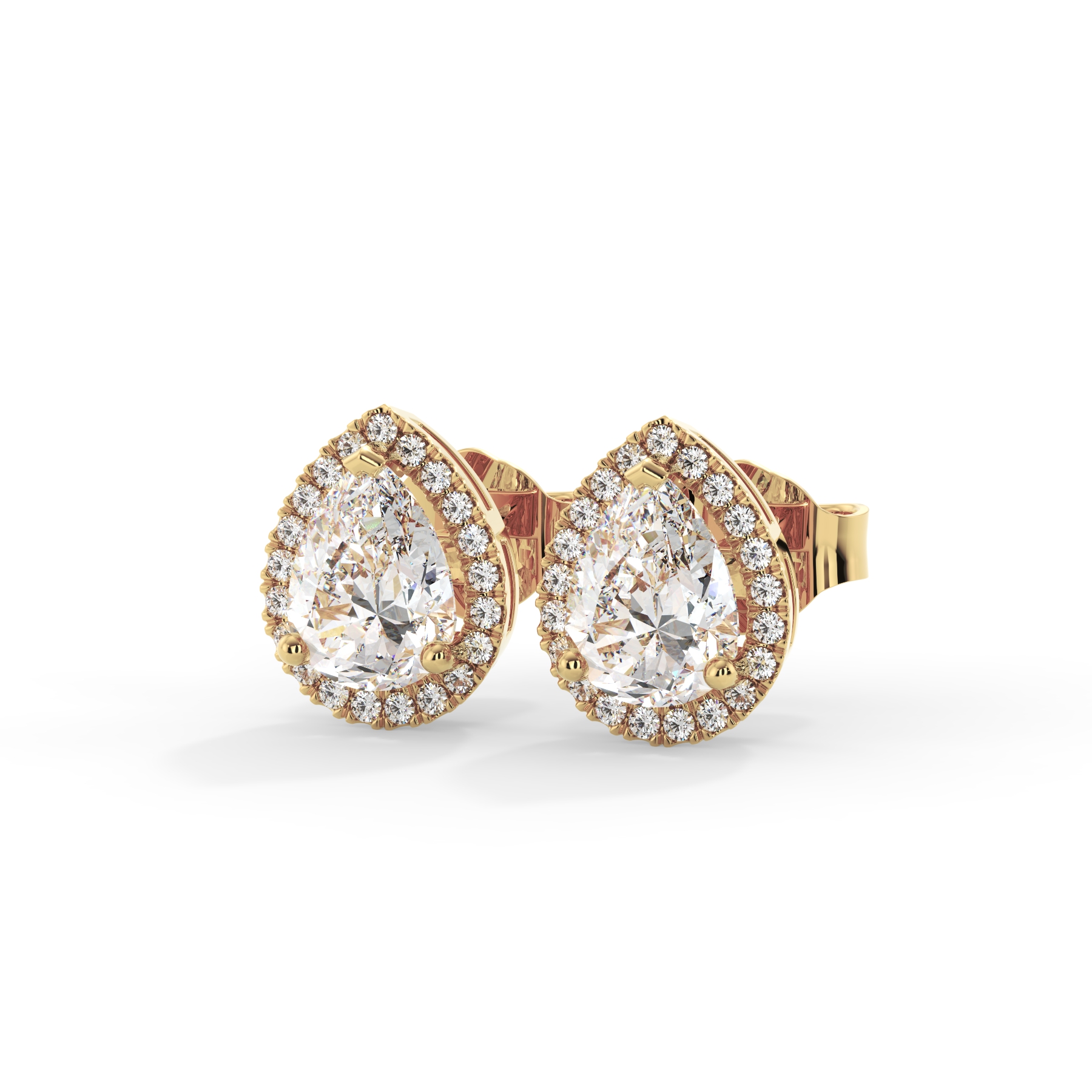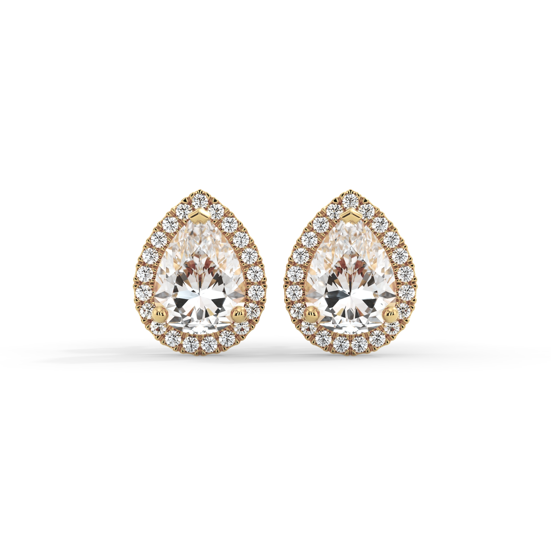 Crafted with 1.00-carat pear-shaped lab grown diamonds (F, VS) and a 0.35-carat diamond halo (D-F, VS) on each, these earrings bring the total carat weight to 2.70 carats, available in yellow, white, or rose gold.